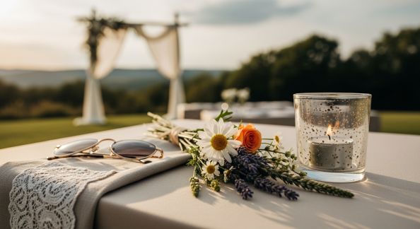Qu’il s’agisse d’une mairie, d’une église ou d’un coin champêtre en extérieur, la décoration de la cérémonie doit annoncer le ton. Mettez l’accent sur les éléments les plus photographiés : arche, bancs ou chaises, allée centrale. Astuce pratique : privilégiez des accessoires réutilisables ou facilement transportables, qui passeront d’un espace à l’autre (ex : vases, photophores, bouquets de chaise, guirlandes fleuries).