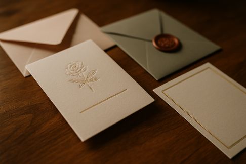 - Variété d’effets créatifs : Ombres portées, filigranes, dégradés, superpositions d’aquarelle ou d’or numérique... Les faire-part prennent vie, des enveloppes aux menus de table, tout en conservant une cohérence graphique.